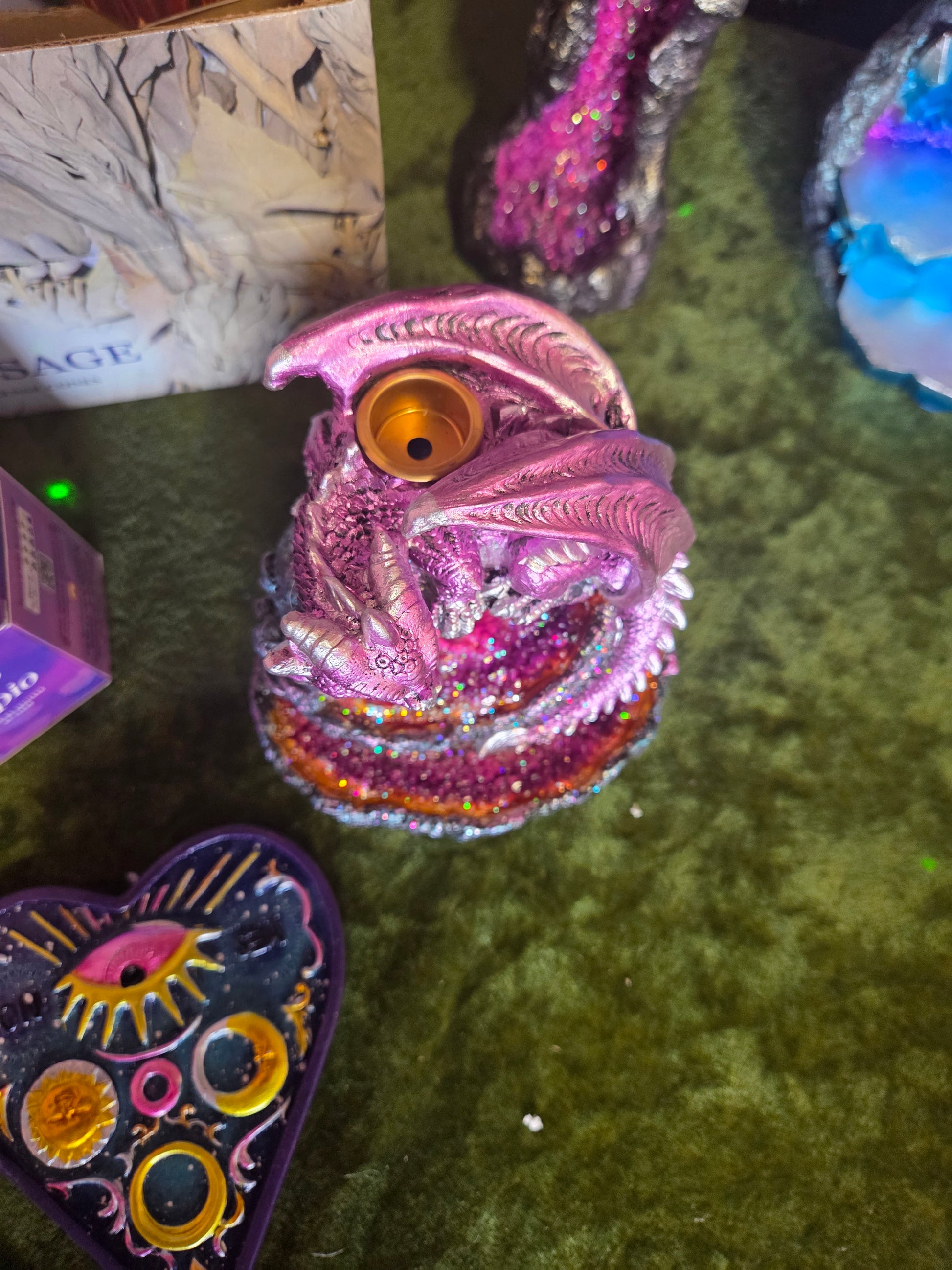 Watch smoke cascade like magic with this enchanting baby purple dragon backflow incense burner! Featuring mesmerizing LED lights that illuminate the flowing smoke, this whimsical piece transforms your space into a mystical sanctuary. Perfect for creating an atmospheric glow while enjoying your favorite incenses. The adorable dragon design adds a touch of fantasy to any room—ideal for meditation, relaxation, or simply adding some magical charm to your décor.